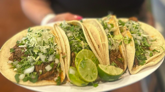 Corn Tortilla, goat birria with cabbage and cilantro.