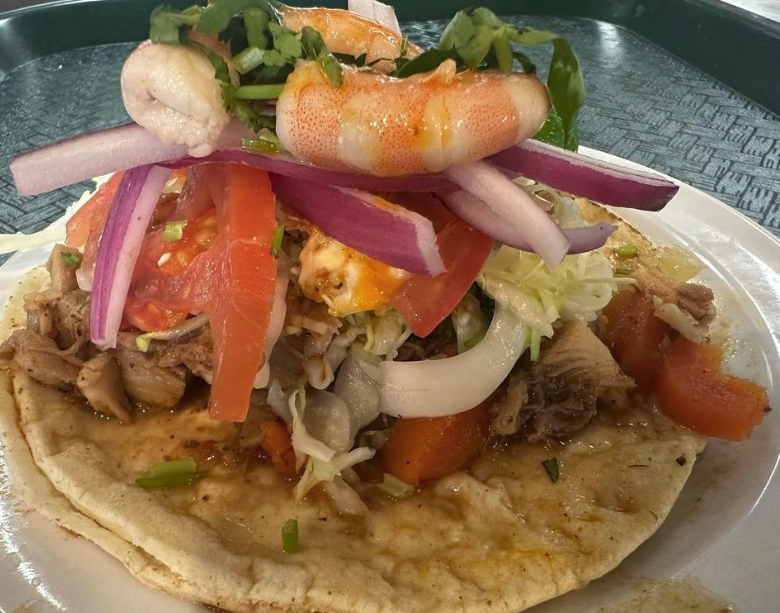 Corn tortilla, fish and shrimp, cabbage and cilantro.